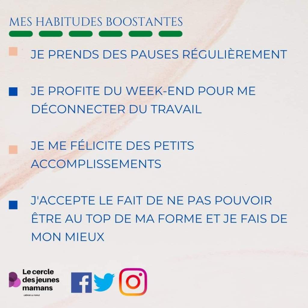 Il n’est pas toujours facile de ralentir ou d’accepter de s’aligner. La plupart des femmes veulent être présentes sur le lieu de travail et donner le meilleur d’elles même, craignant pour leur place. Adaptes ton rythme de travail à ton nouvel état de santé ne sera pas toujours suivi le coeur léger mais il le faut !